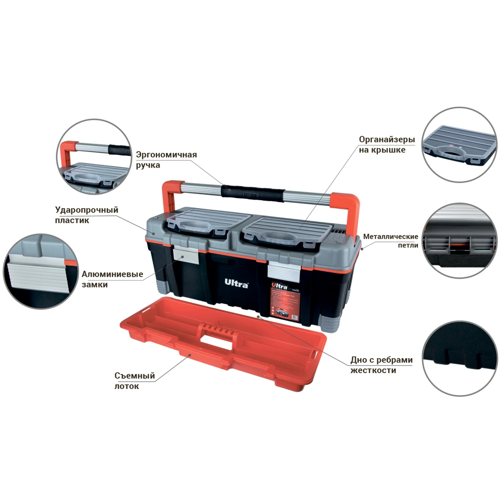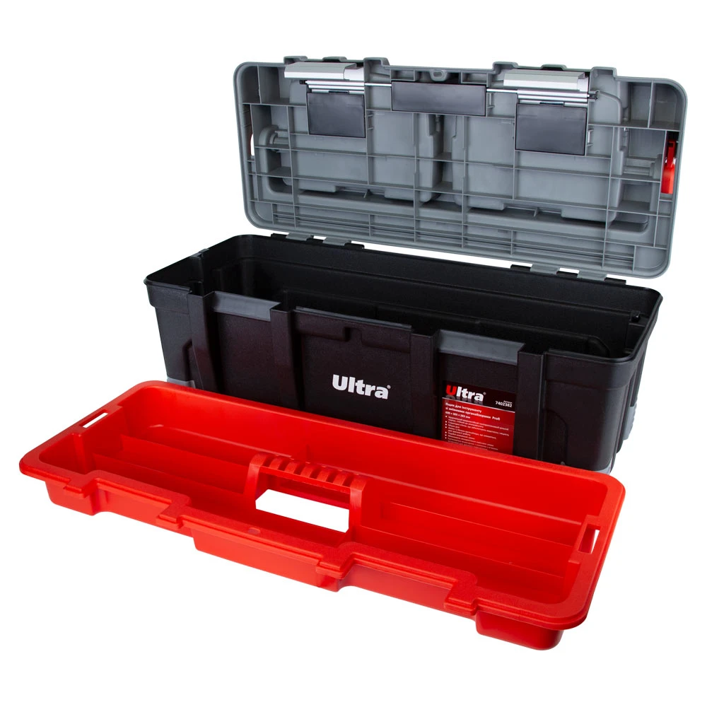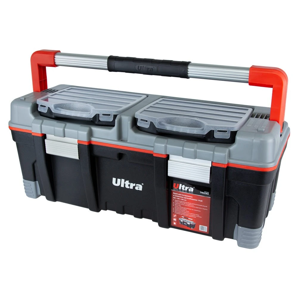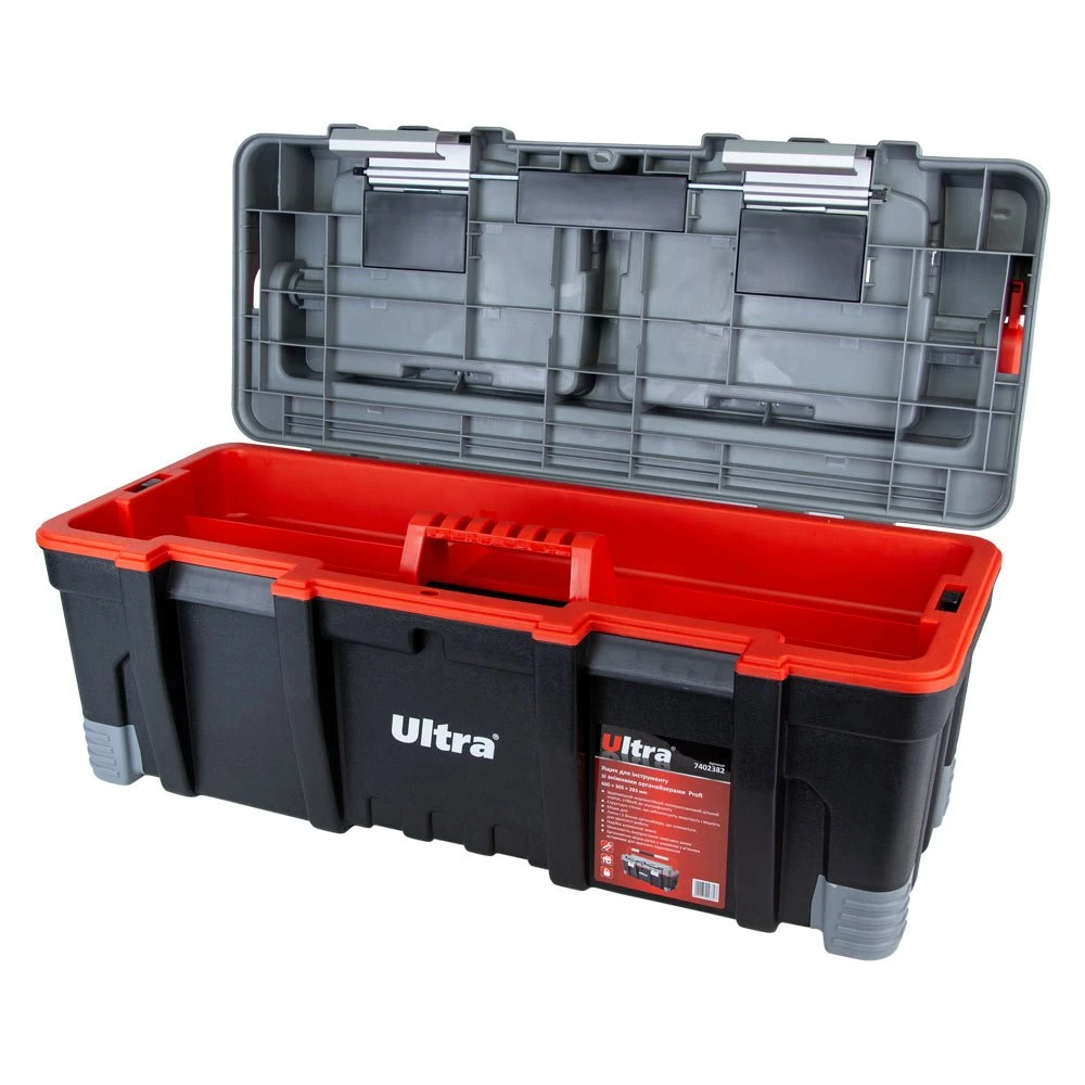 Ящик для інструменту зі знімними органайзерами Profi 600×305×283мм ULTRA (7402382) призначений для зберігання, транспортування, перенесення і зручного доступу до ручного інструменту. Допомагає системно організувати зберігання дрібних деталей: кріплення, шайб, гайок та інших дрібниць. Простота в пошуку необхідних деталей забезпечується наявністю декількох секцій. Функціональний і знаходить застосування в багатьох сферах діяльності: перенесення індивідуальних інструментів, комплектація наборів інструментів і дрібних деталей для домашнього майстра, забезпечення працівників комунальних служб комплектом устаткування, укладання дрібних предметів на відпочинку - риболовлі, полюванні, рукоділлі; при комплектації необхідного набору інструментів і аксесуарів для автомобіля, майстерні, гаража або СТО, а також зберігання найрізноманітніших предметів в побуті.