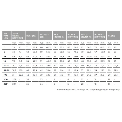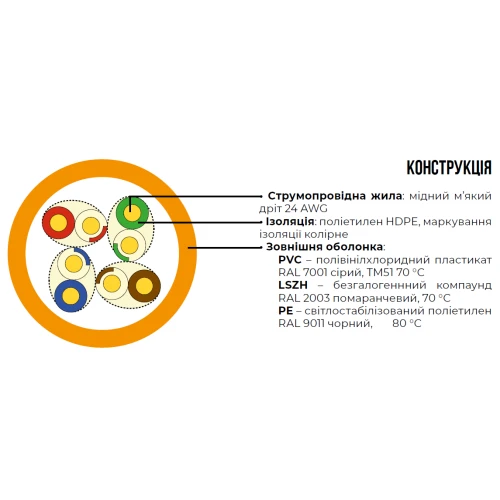 Cat. 5e F/UTP 4x2x24AWG PE-кабель для цифрового зв'язку. Конструктив: багатожильний, симетричної парної скрутки. Призначений для зовнішньої прокладки структурованих кабельних мереж по стінах будівель, шахтах і колекторах при частотах до 100МГц в умовах підвищених електромагнітних впливів. Виробник: Запорізький завод кольорових металів (ЗЗЦМ).