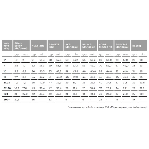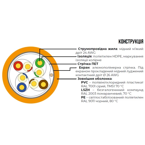 Cat. 5e U/UTP 4x2x24AWG-кабель для цифрового зв'язку. Конструктив: багатожильний, симетричної парної скрутки. Призначений для структурованих кабельних мереж при одиночній прокладці всередині приміщення та апаратури при частотах до 100МГц. Виробник: Запорізький завод кольорових металів (ЗЗЦМ).
