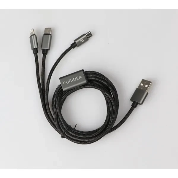 Багатофункціональний USB-кабель 3 в 1 виготовлений компанією виробником PURIDEA, він призначається для синхронізації пристрою з персональним комп'ютером і виконання зарядки. Кабель має спеціальну функцію швидка зарядка та швидка синхронізація. Кабель виготовляється з луженої мідної основи, усім відомо, що мідь є найнадійнішим провідником і використовується лише у високоякісних виробах. Мідна основа покривається міцним ізолятором, поверх ізолятора є тканинне покриття, яке служить для надання кабелю сучасного зовнішнього вигляду та додаткового захисту. USB 2.0 роз'єм володіє сумісністю з усіма версіями USB, а на зворотному боці кабелю можна спостерігати роз'єми micro USB, Lightning, USB type C, вони у свою чергу сумісні з iPhone і Android. Завдяки даним роз'ємам ви можете використовувати всі можливості власних девайсів. Самі роз'єми виконані з високоякісного металу, для поліпшення якості та швидкості переданого сигналу вони мають нікельоване покриття, також дане покриття забезпечує швидке під'єднання і надійний контакт.