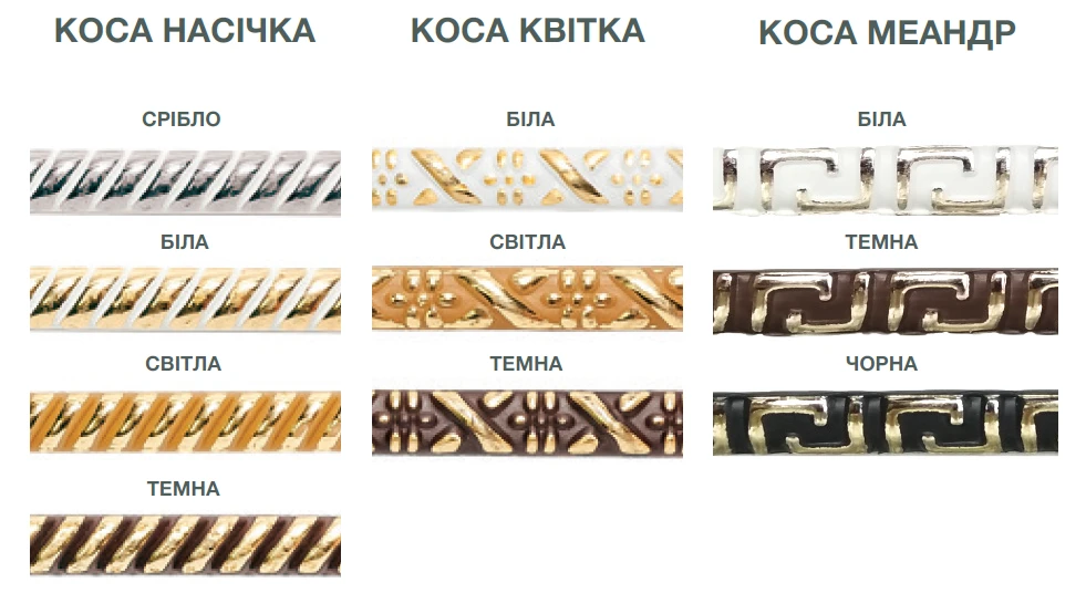 Самоклейка: бук, в'яз темний, дуб вибілений, дуб золотий, дуб ясний, махонь, мармур бежевий, мармур блакитний, мармур зелений, мармур рожевий, мармур темний, горіх, сосна, черешня.