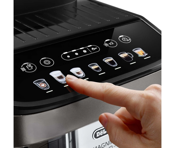 Зручна сенсорна панель керування із підписаними піктограмами клавішами дозволяє замовити улюблений напій в одне натискання. А приготування забезпечує складна внутрішня "кавова фабрика". Спочатку зерна будуть помелені до заданого ступеня у вбудованій кавомолці (обсяг контейнера для зерен на 300 г і 13 рівнів помелу на ваш вибір), а потім ними «займеться» помпа потужністю 15 Бар – стандартна для кавомашин середнього класу, до яких і відноситься ваша DeLonghi ECAM 290.81 TB. Ви маєте можливість заварити еспресо за стандартним рецептом або навіть запрограмувати свій власний варіант, зберігши його в пам'яті пристрою. Просто визначте кількість води, бажаний ступінь помелу та температуру. Одночасно подається до 2-х порцій еспресо у дві чашки. У швидкому доступі за одним натисканням також є каво-лонг.