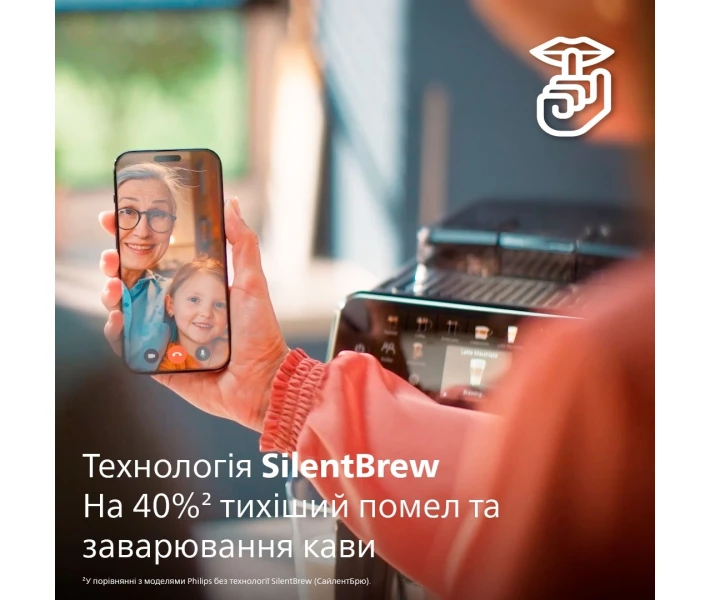 На 40%² тихіше розмелювання та заварювання кави з нашою інноваційною технологією SilentBrew, щоб ви могли більше насолоджуватися приготуванням ароматної кави.