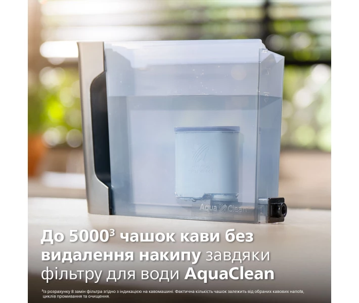 Захищає кавомашину від вапняного нальоту. Змінивши фільтр після нагадування кавомашини, Ви зможете насолоджуватися чистою та прозорою водою протягом приготування до 5000 чашок³ без потреби видаляти накип.