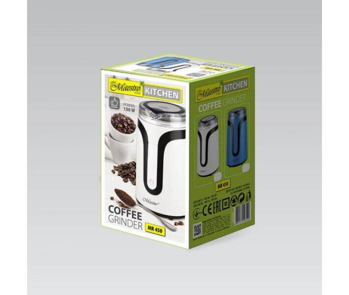 Електрична кавомолка для дому Maestro HR450 150 Вт міні кавомолки ножові подрібнювач кавових зерен Електрична кавомолка - необхідний апарат для приготування справжньої ароматної кави, адже тільки із свіжомелених кавових зерен можна приготувати ідеальний напій. Домашня кавомолка позбавить Вас необхідності молоті кави в спеціальних магазинчиках або купувати мелену каву, нехай навіть і дуже якісну, але все одно не свіжого помелу. Молоть тверді продукти не під силу навіть кухонним комбайнам. Тому на кожній кухні має бути кавомолка. Вона допоможе Вам самостійно приготувати приправу, що складається із різних спецій. Адже домашнє завжди смачніше та корисніше, купленого в магазині чи на ринку. Кавомолка даної моделі Maestro MR 450 допоможе Вам подрібнити обсмажені кавові зерна, з яких Ви приготуєте ароматну, смачну каву, що бадьорить. Ви зможете насолодитись його смаком у колі рідних, близьких, друзів. Кавомолку також можна використовувати для подрібнення спецій, круп, вівсяних пластівців, горіхів та насіння, цукру, солі, маку, сухарів.