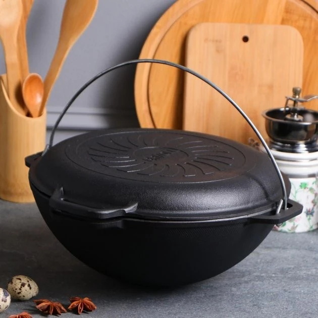 Азіатський чавунний казан ємністю 4 л. Укомплектований дужкою та чавунною кришкою-сковородою. Призначений для приготування страв на багатті або мангалі, що потребують гасіння, томлення та приготування у власному соку.