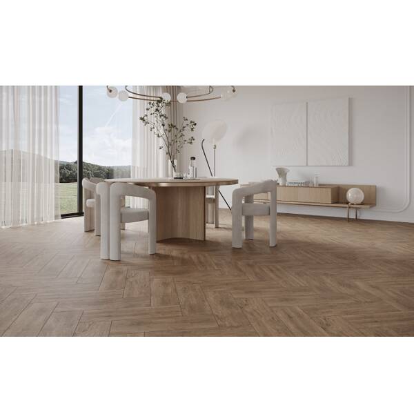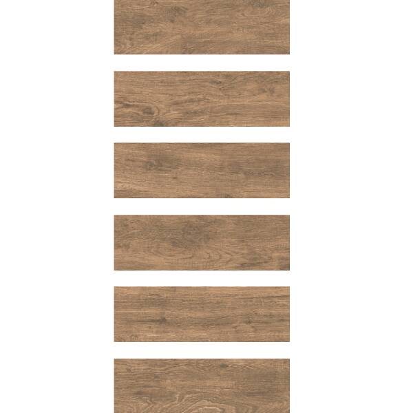 Керамограніт у теплому коричневому відтінку з текстурою дерева додає затишку та природної естетики в інтер’єр. Ідеально підходить для укладання у вітальнях, кухнях, коридорах або ванних кімнатах. Формат 185×598 мм імітує дерев’яні планки, створюючи ефект натуральної підлоги, при цьому має високу міцність та зносостійкість.