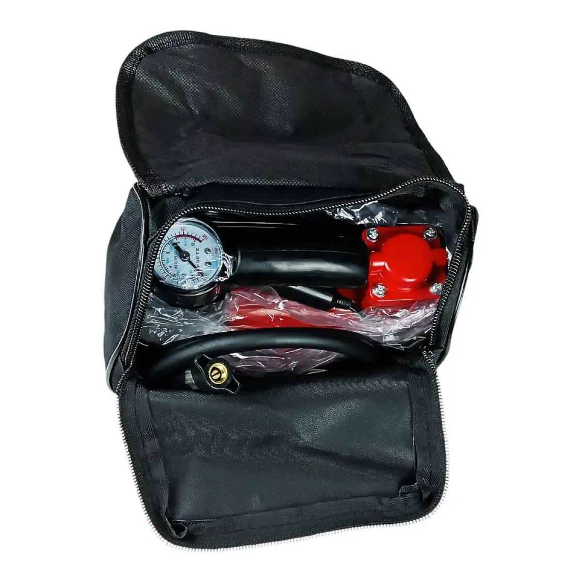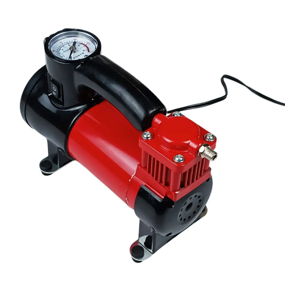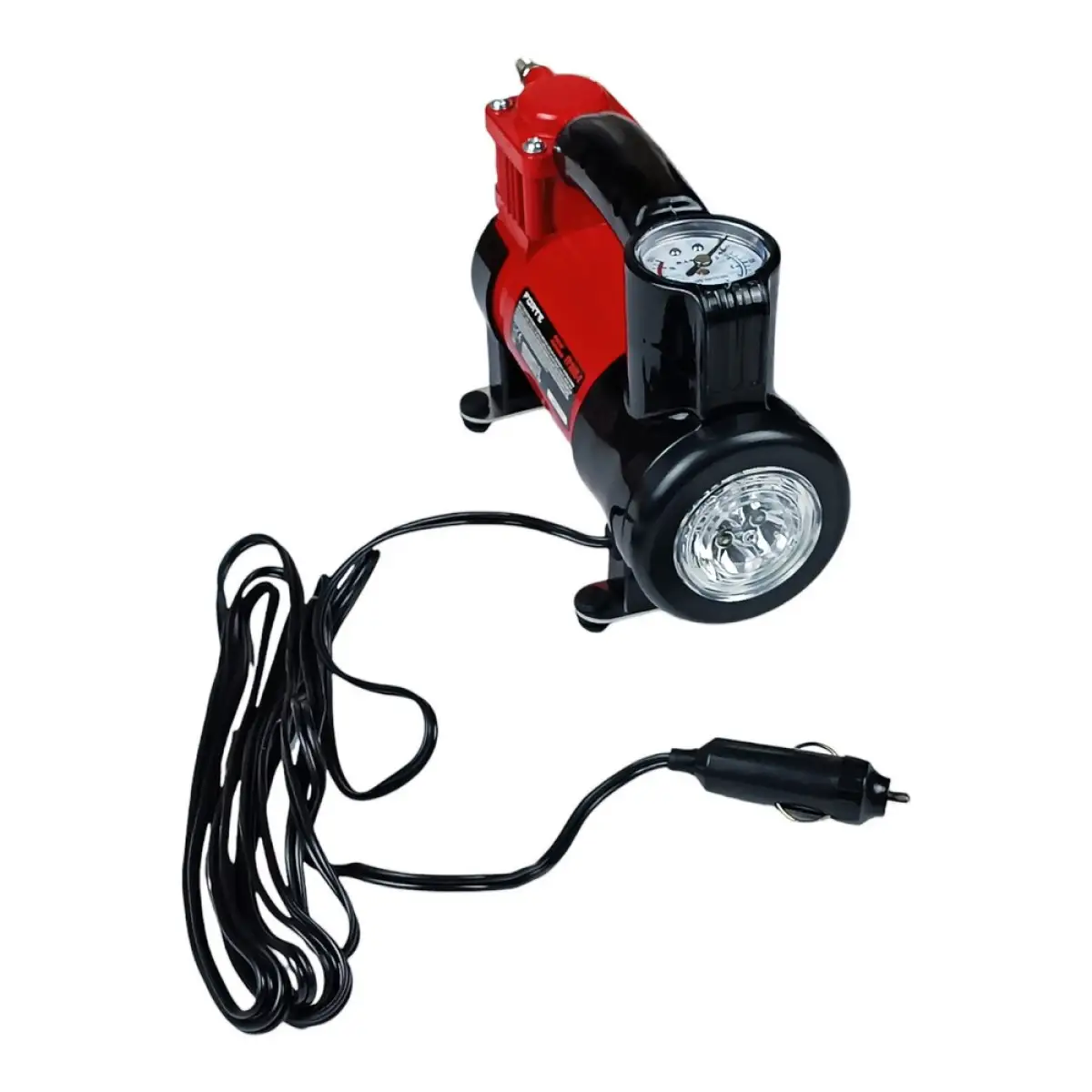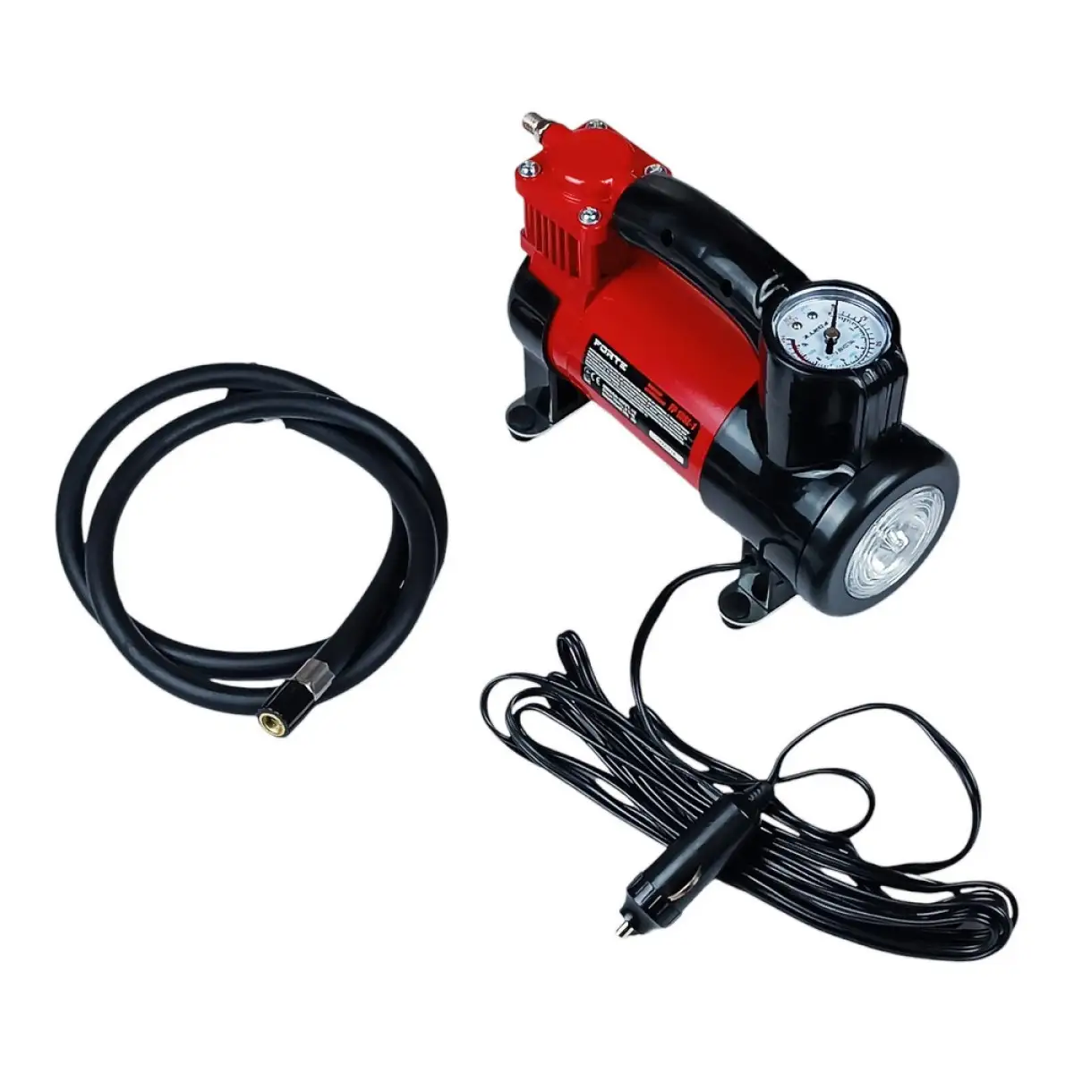 Компрессор автомобільний FP 10SL-1 призначений для швидкого накачування шин автомобілів, велосипедів, мопедів і різних розважальних, спортивних предметів (м ячів, кіл, човнів). Головною перевагою компресора є металевий поршень і шатун із тефлоновим кільцем ущільнювача. Корпус компресора виготовлений із металу, завдяки чому швидко й ефективно розсіює тепло від електродвигуна під час роботи. Компресор обладнаний аналоговим манометром. Переваги: Вбудований ліхтарик Сумка для зберігання Максимальний струм споживання: 10 А Високоточний манометр Максимальний тиск 7 АТМ Висока продуктивність 35 Л/ХВ