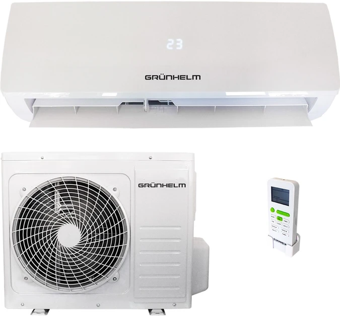 Настінний кондиціонер компанії Grunhelm - це потужний у своїй бюджетній категорії агрегат. Здійснює охолодження, обігрів, вентилятор, авто-осушення повітря. Хладогент R32 хімічна формула CH2F2. Низький рівень шуму. Економічний режим. Незалежне осушення. Таймер 24 години.
