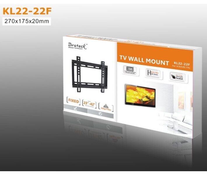 Настінне кріплення Brateck дозволяє закріпити на стіні LCD панель діагоналлю 23 "- 42", вагою до 35 кг. Відступ від стіни: 19.5 мм. Brateck високоміцне виріб, завдяки сучасній технології виробництва з додатковим ущільненням матеріалу і, відповідно, зміцненням вироби і збільшенням його стійкості до навантажень.