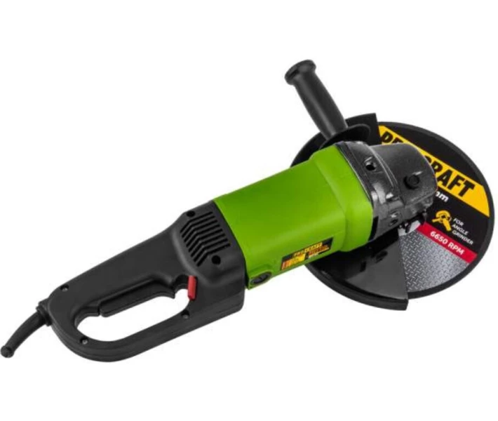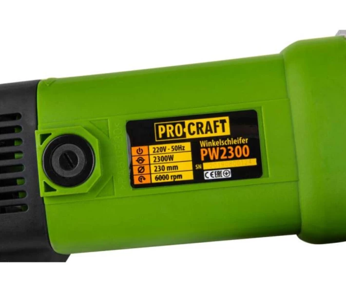 Procraft PW2300 - професійний інструмент, призначений для шліфування каменю, цегли, граніту, нарізки металу, будівельної плитки, бетону або інших матеріалів. Завдяки чималим розмірам, в корпусі болгарки поміщається потужний металевий редуктор що в поєднанні з високоспритний 2300 Вт двигуном дає максимальний момент сили на виході. Для захисту мотора від перегріву при тривалій роботі або великих навантаженнях, виробник передбачив спеціальні вентиляційні отвори під деяких місцях корпусу. Додаткова рукоятка встановлюється шляхом вкручування її в одне з трьох різьбових отворів в корпусі редуктора за годинниковою стрілкою до повної фіксації. Сама по собі болгарка не потребує складному технічному обслуговуванні, після роботи потрібно всього лише провести легке очищення інструменту від стружки, пилу та інших сторонніх речовин. Для швидкої заміни вугільних щіток двигуна (додаються в комплекті), присутні спеціальні отвори з гвинтами, які легко відкручуються будь викруткою.