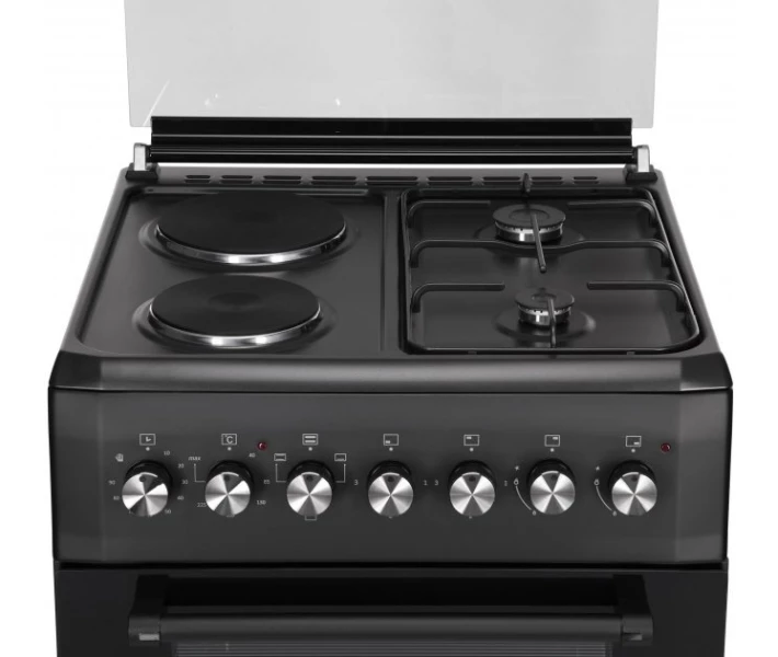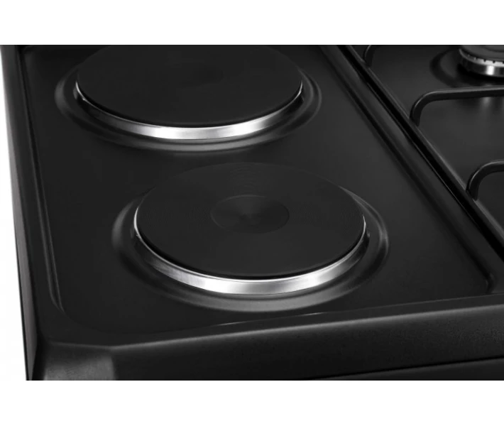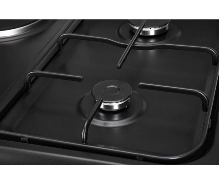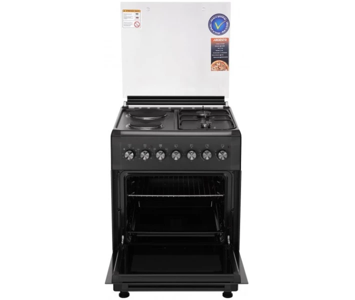 Дует двох типів конфорок Комбінована плита ARDESTO є вдалим, практичним варіантом, адже в разі припинення електропостачання завжди буде запасний варіант – газові конфорки. Конфігурація варильної поверхні: два газові пальники (2,6 і 1,55 кВт) та дві електричні чавунні конфорки (180 мм та 145 мм) потужністю 1 500 і 1 000 Вт відповідно. Загальне споживання газу становить 0,395 м³/год. На газові конфорки встановлено емальовану решітку. Для підключення плити до системи газопостачання конструкцією передбачено форсунки NG (G20 – 13 мбар), а щоби користування пристроєм було безпечним, є функція газ-контролю. Запалювання повністю автоматичне – просто треба натиснути на поворотне коліщатко відповідної конфорки й прокрутити його. Електрична духова шафа Енергоефективна духова шафа (клас энергопотребления А) має об’єм 58 л. Дверцята оснащено подвійним склом, що затемнене вздовж країв, тільки в центрі є більш прозоре оглядове віконце. Зсередини камера вкрита емаллю, що легко очищається, на бічних стінках – рельєфні напрямні кількох рівнів висоти. У духовці вбудовано два нагрівальні елементи: потужність верхнього становить 1 100 Вт, а нижнього – 1 200 Вт. Крім того, для зручності передбачено освітлення духової шафи (25 Вт) та відкидний нижній ящик, в якому можна зберігати кухонне приладдя, зокрема дека чи пательні. Контролювати час приготування зручно завдяки вбудованому таймеру. Комплектація Комбінована плита постачається з усіма необхідними аксесуарами, зокрема в комплекті є стандартне деко та решітка. Крім того, додатково виробник надає форсунки для під’єднання до балона зі скрапленим газом (LPG). У разі використання саме такого типу пального рекомендовано підключати плиту до композитних балонів Hexagon Ragasco, що абсолютно вибухобезпечні, навіть під час пожежі усунуто ризик вибуху. Модель стандартного розміру (за ширини 59,7 см глибина становить 63,1 см), тож вдало пасуватиме вже до готового кухонного гарнітура.