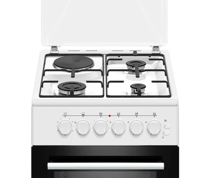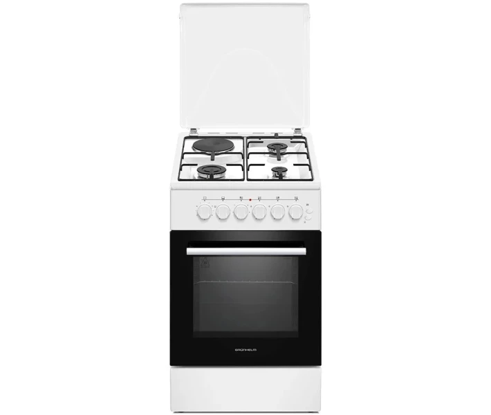 Grunhelm G4FM6611WG – кухонна плита з комбінованою варильною поверхнею та газовою духовкою 58 л. Варильна поверхня з емальованої сталі має 3 традиційні газові конфорки та 1 чавунний нагрівальний елемент. Регульовані ніжки, щоб змінити висоту плити та надійно встановити її.