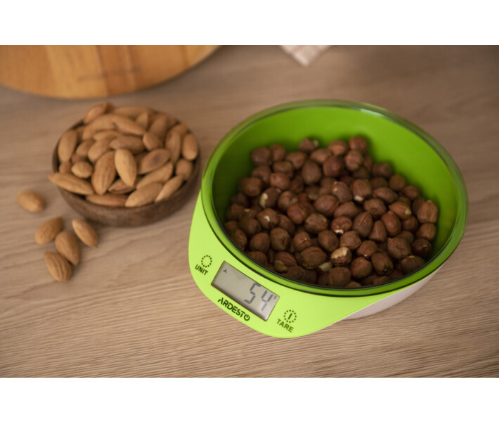 Оригінальні електронні кухонні ваги зі знімною чашею та сенсорною панеллю управління – новинка в асортименті ARDESTO. Їхня унікальна форма дозволяє проводити зважування без додаткового посуду, досить просто насипати або вилити інгредієнти прямо в чашу. З вагами ARDESTO SCK-900BGR точність та досконалість стануть основними характеристиками страв користувача. На них можна проводити зважування продуктів вагою від 2 г до 5 кг з кроком виміру 1 г. Для зручності передбачена функція тарування та зміни одиниць виміру, що може стати в нагоді при відтворенні рецептів з іноземних кулінарних книг або блогів. Чудова якість зважування забезпечується високоточним датчиком та надійною електронікою. Управління вагами відбувається через сенсорну панель. Зручний РК-дисплей не лише відображає вагу продуктів у чаші, але й сигналізує, якщо вона перевищує 5 кг та наближається час заміни елементів живлення.