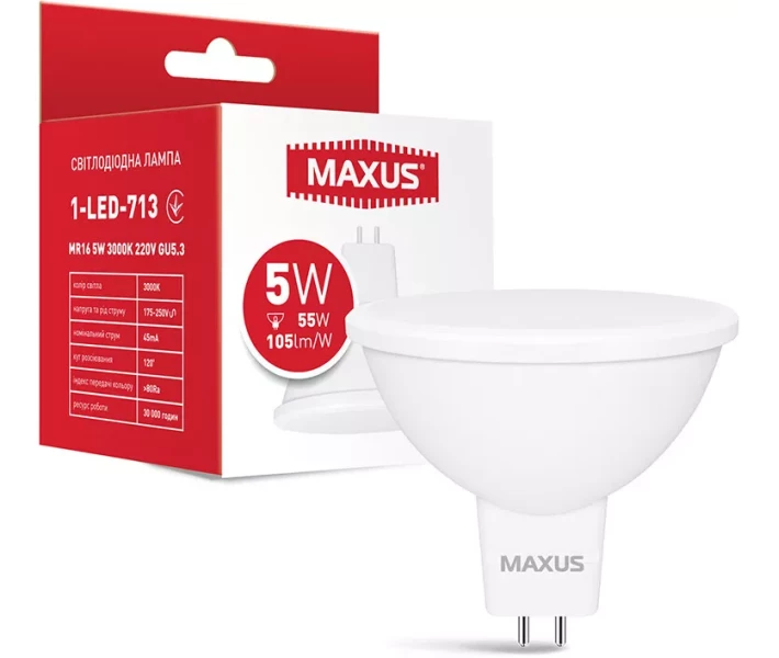 Інформація Лампа світлодіодна MAXUS 1-LED-713 MR16 5W 3000K 220V GU5.3