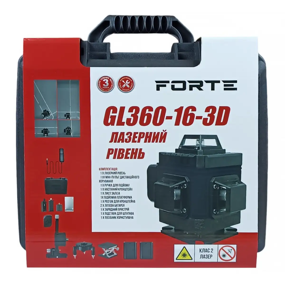 Інформація Лазерний нівелір Forte GL360-16-3D,робочий дiапазон 25 метрiв у діаметрі, зелене світло,3 Д,16 ліній