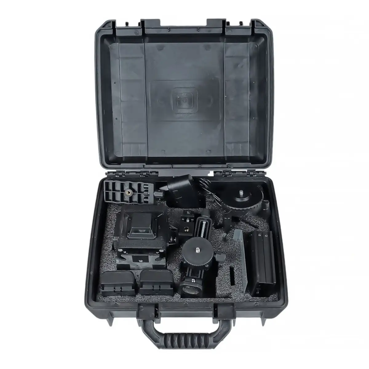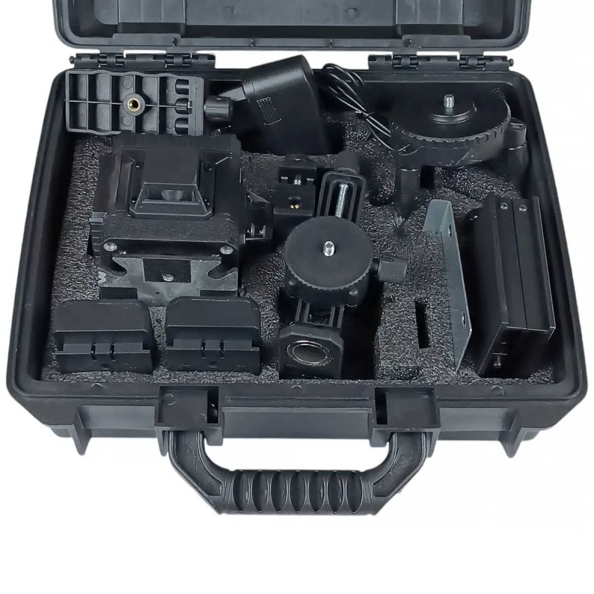 Лазерний нівелір LLD-180-2G Forte — це сучасний та функціональний виріб, призначений для проектування горизонтальних та вертикальних ліній або площини при виконанні робіт всередині та зовні приміщень. Потужна акумуляторна батарея забезпечує роботу лазерного рівня до 8 годин, крім того передбачена можливість роботи під час зарядки. Ергономіч- ний пластиковий корпус забезпечує зручність користування. Переваги: Лазерний промінь 16 ліній 4D Автоматично вирівнюється Функція будильника Колір лазера - зелений Лазерний рівень випромінює вертикальні та горизонтальні площини, можливе увімкнення окремих режимів випромінювання та одночасно всіх Поворотна платформа значно полегшує роботу з лазерним рівнем Цей прилад використовується для вертикального планування, створення відміток під час прокладання інженерних мереж, а також при бетонуванні підлог і стяжок. Таким приладом можна працювати і на похилих поверхнях. Закріпивши на ньому лазерний рівень, ми зможемо точно і рівно виконати обробку стіни паралельно сходах. Комплектація: 1 x Лазерний рівень 11x міні-пульт дистанційного керування 1 x ручка для підйому 1 x настінний кронштейн 1 x лист заліза 1x підйомна платформа 1 x роз єм для кронштейна 2 x літієва батарея 1 x зарядний пристрій 1x сумка для інструментів 1 x підстава для штатива 1 x посібник користувача