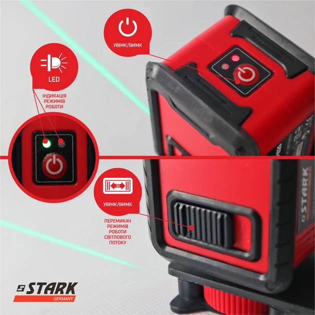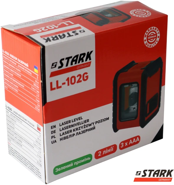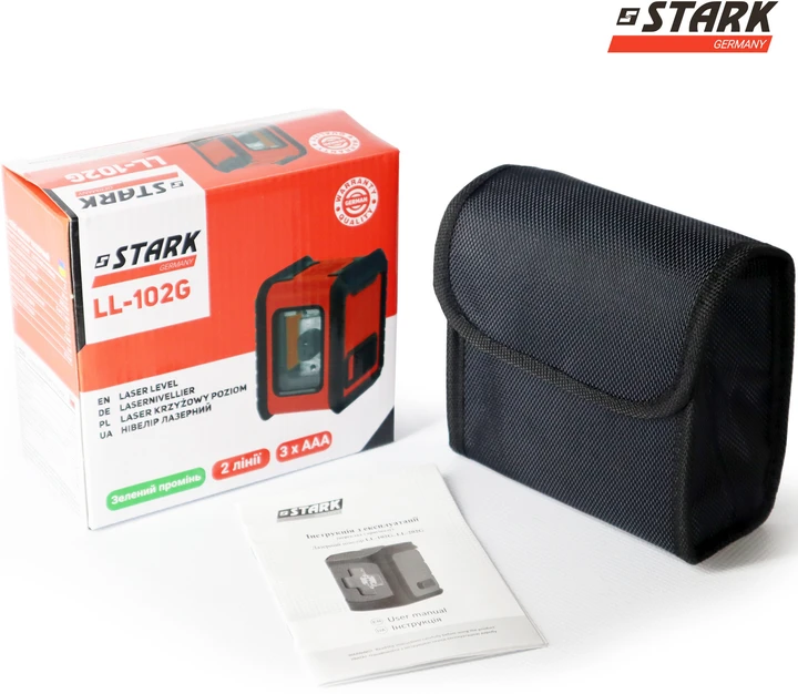 Лазерний рівень Stark LL-102G - інструмент, із 2 зеленими променями, які створюють горизонтальну і вертикальну лінії. Призначений для використання в будівельних і ремонтних роботах.