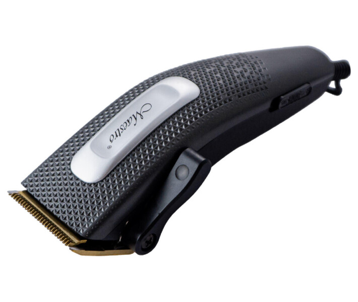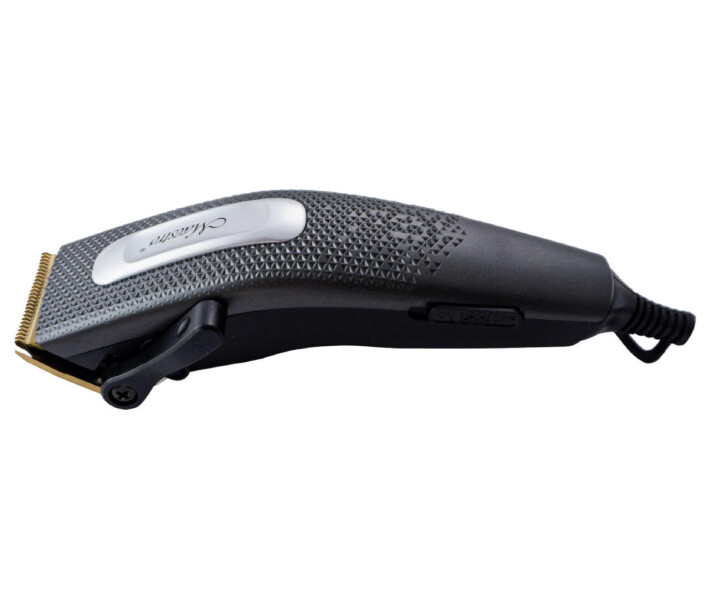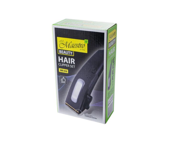 Машинка для стрижки волосся Maestro MR 656 Ti потужністю 7 Вт із ножами з титановим покриттям. У комплекті поставляються чотири змінні гребені (3, 6, 9, 12), олія для змащування ножів, щіточка для чищення, ножиці та гребінець.