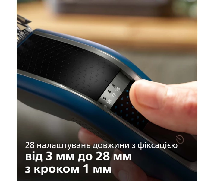 Поверніть колесо регулювання для вибору та фіксації потрібного параметру довжини. На двох регульованих гребенях доступна довжина від 3 до 28 мм з інтервалом 1 мм. Використовуйте гребінь для щетини 2 мм для короткої стрижки або догляду за бородою. Зніміть гребінь для підстригання за довжиною 0,5 мм.