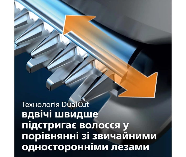 Удосконалена технологія DualCut: завдяки інноваційному двосторонньому різальному блоку стриження удвічі швидше, порівнюючи з одинарним.