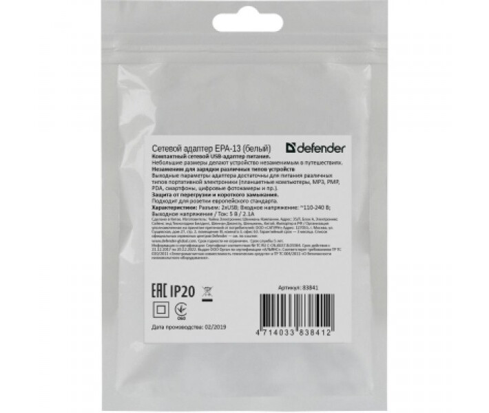 Інформація Мережевий зарядний пристрій Defender EPA-13 1xUSB 5V 2.1A