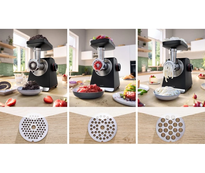 (3 мм, 4.5 мм і 8 мм) забезпечують легке подрібнення сирого або вареного м'яса,риби та сиру. Можна мити в посудомийній машині.