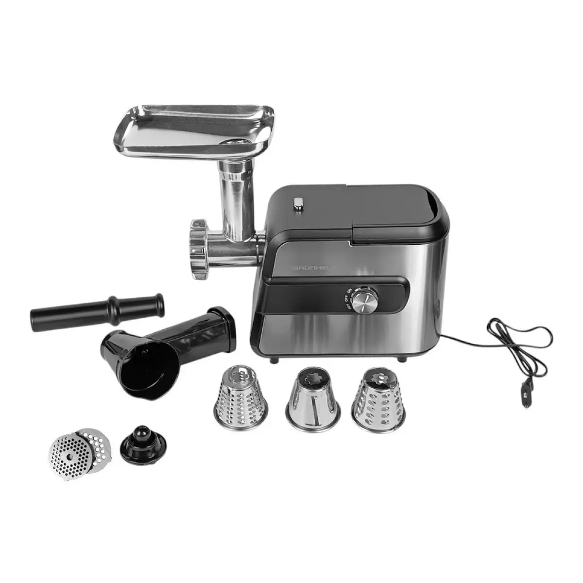 Мясорубка AMG200SS Grunhelm легко і швидко перемелить будь-яке, навіть тверде м ясо, наріже або натре овочі, приготує сосиски та багато іншого. За допомогою набору аксесуарів, які входять до комплекту: 3 решітки для різного перемелювання м яса, 3 барабани для нарізки та шинкування, насадки для ковбас та кеббе, можна швидко і легко приготувати безліч рецептів. Компактність конструкції та вбудована велика ручка дозволяють зручно зберігати та транспортувати прилад.