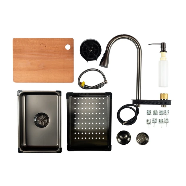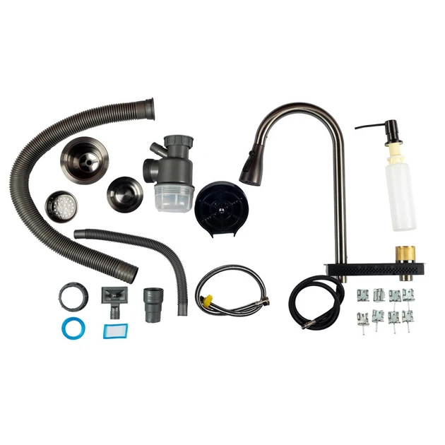 Комплект постачання включає сифон, дозатор, два кошики, дошку, змішувач та омивач склянок, що робить цю мийку ідеальним вибором для повсякденного використання. Всі ці елементи дозволяють максимально ефективно організувати робочий простір на кухні.
