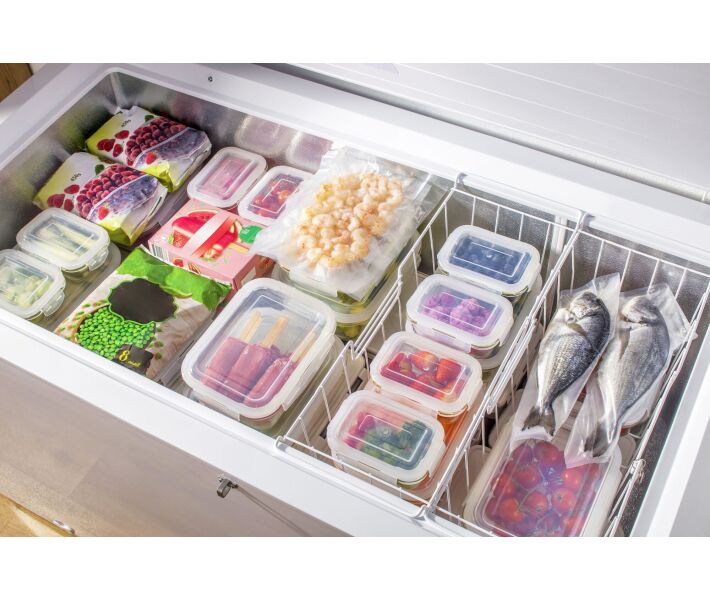 Внутрішній простір морозильника можна структурувати так, як це зручно вам. А все завдяки полицям у вигляді сітчастих кошиків. Великий об'єм не зроблений одним цілісним масивом, тому на поличках можна розмістити ті речі, які необхідні в найближчому майбутньому, щоб не шукати їх довше звичайного.