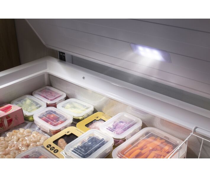 На окрему увагу заслуговують дверцята морозильної скрині. Вона розташована в верхній частині, але це не просто кришка - дверцята мають доводчик. А це означає, що закриття їх буде здійснюватися максимально легко і без ризику гупання. Зручна ручка на передній частині робить використання морозильної скрині ще комфортніше.