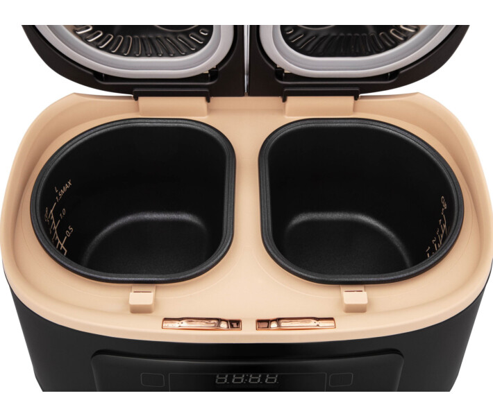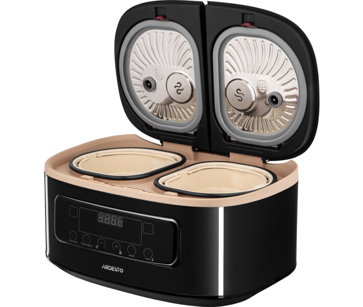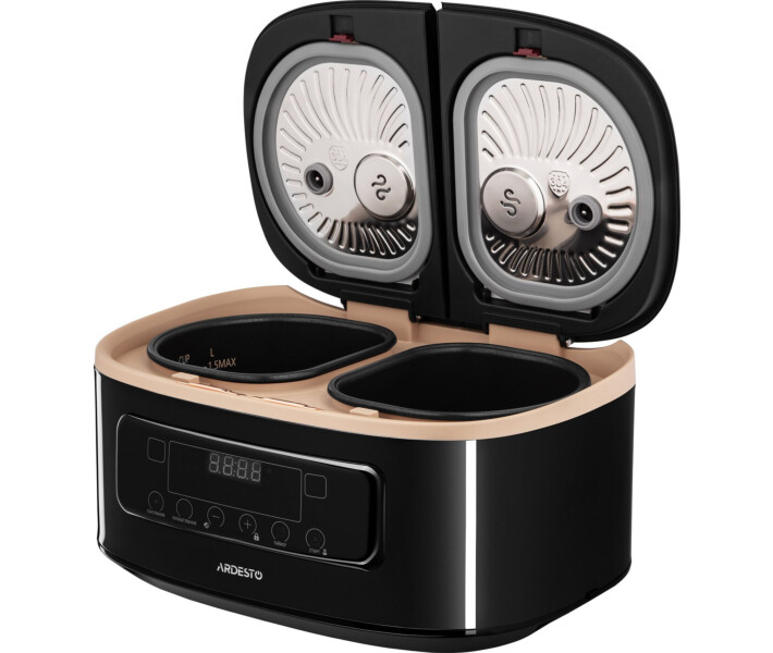 Багатофункціональна мультиварка ARDESTO DMC-SS1812B чорного кольору йде в комплекті з двома чашами об'ємом 2,5 л з антипригарним покриттям Daikin. Пристрій оснащений спеціальною технологією, завдяки чому можна готувати від 2 до 4 страв одночасно. Чаші не торкаються один одного та мають незалежні ТЕНи. Для кожної чаші можна використовувати індивідуальні параметри приготування. На вибір – 16 автоматичних програм. LED-дисплей забезпечує додатковий комфорт під час приготування. Мультиварка із двома чашами ARDESTO DMC-SS1812B – це маленький шеф-кухар, якому можна доручити приготувати практично будь-яку страву, серед яких супи, каші, випічка, йогурти тощо. - Дві чаші з незалежним налаштуванням програм для кожної - Місткість чаш 2,5 л - Товщина стінок чаш 1,8 мм - Можливість приготування до 4 страв одночасно - Зручне інтуїтивне сенсорне керування - Програма "Свій рецепт" - Автопідігрів - Функція відкладеного старту