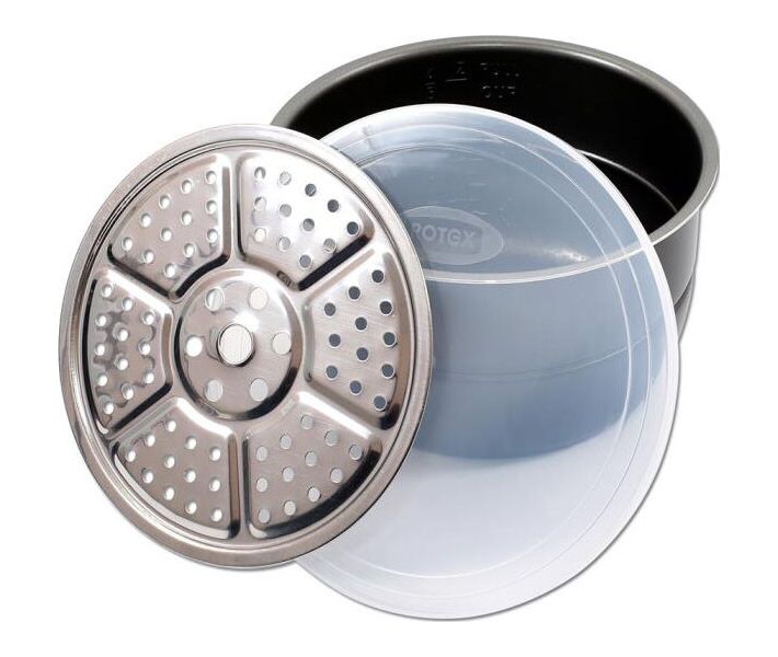 Конструкція мультиварки оснащена додатковою деталлю - пароваркою з алюмінію. Вона має перфоровану будову, за рахунок чого гаряче повітря рівномірно впливає на їжу. За рахунок того, що основа металева, вона добре витримує навантаження з великою вагою.