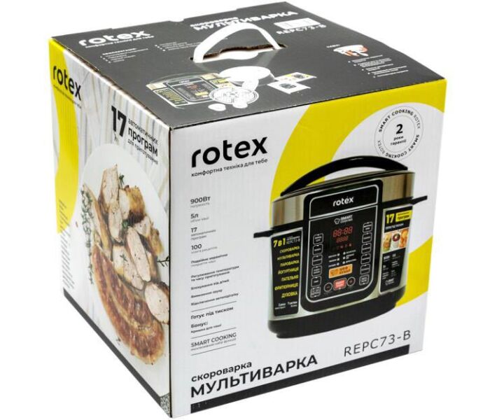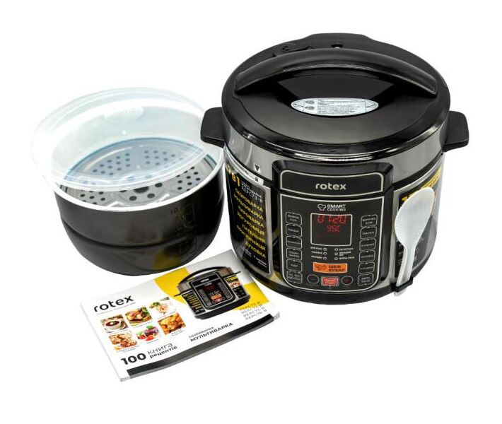 Мультиварка Rotex REPC73-B; Мірний стакан; Плоска ложка; Кришка з харчового пластика для чаші; Шнур електроживлення; Книга рецептів; Інструкція
