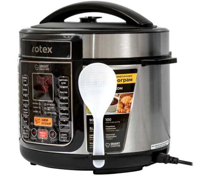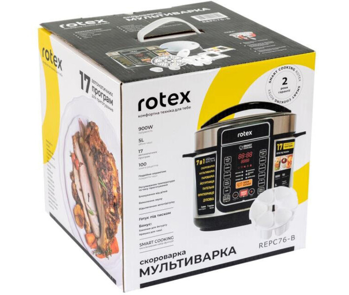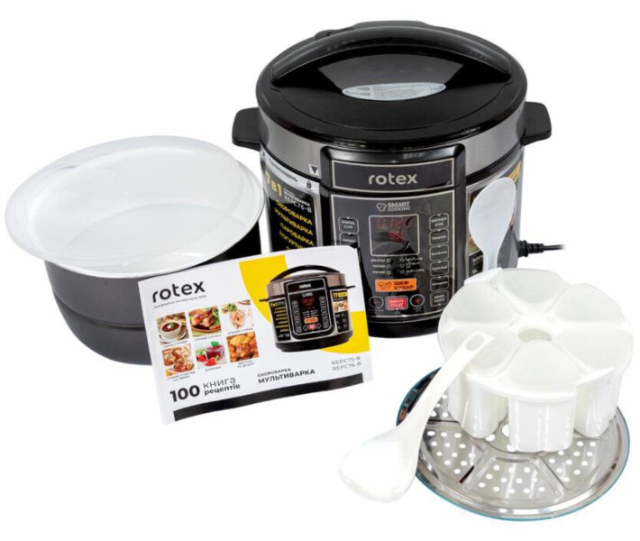 Мультиварка Rotex REPC76-B; Мірний стакан; Плоска ложка; Контейнер для приготування на пару; Шнур електроживлення 1.2 м; Книга рецептів; Інструкція по експлуатації; Сервісна книга