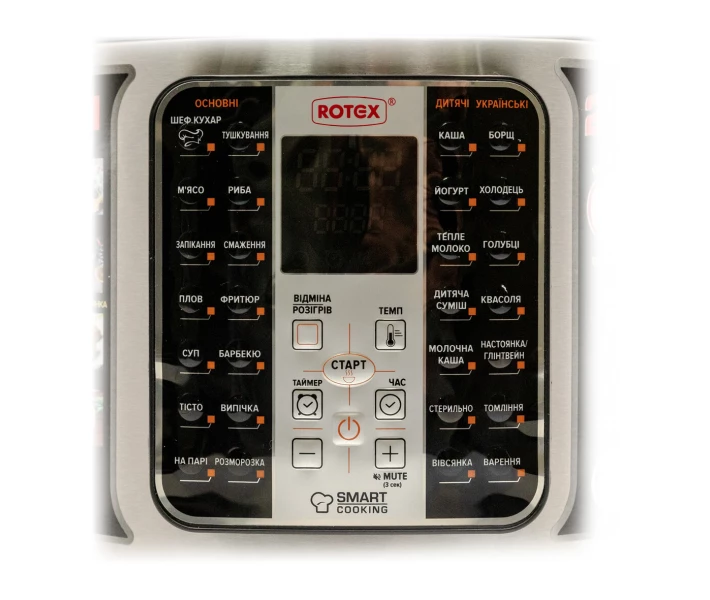 Мультиварка Rotex RMC401-B Smart Cooking має електронне управління. На корпусі спереду розташовується панель з кнопками, над якою розміщений світлодіодний дисплей. Кожна з кнопок підписана відповідно виконуваного пункту меню. На дисплеї відображається час циклу роботи і показник температури.
