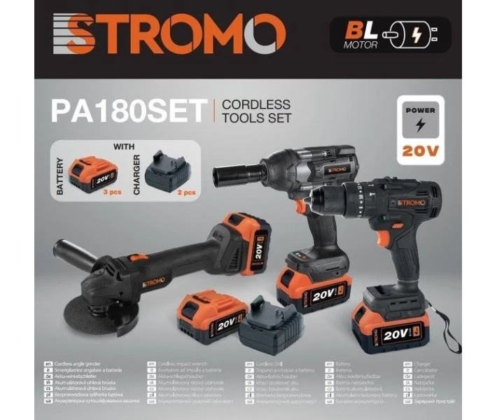 Акумуляторна болгарка Stromo AGA180; Акумуляторний гайковерт ударний Stromo AWA20; Акумуляторний шуруповерт Stromo SA18Pro; Акумулятор 3 шт (4 Аг, 20 В); Зарядний пристрій 2 шт; Інструкція; Гарантійний талон; Картонна упаковка