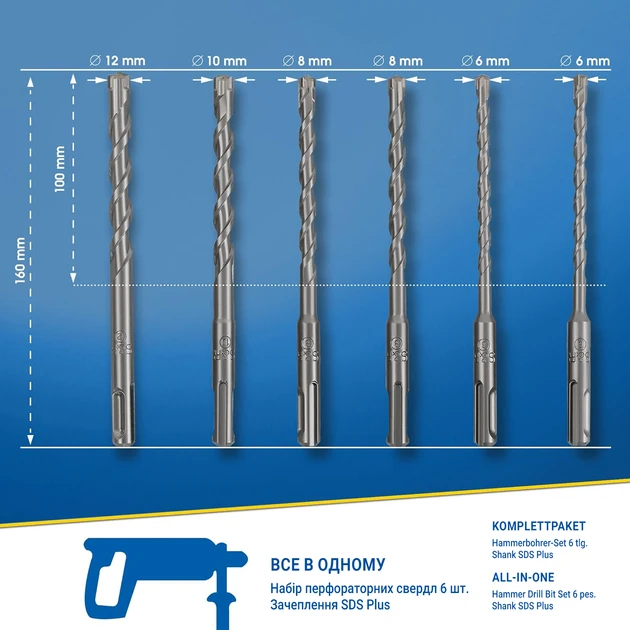 У наборі ви отримаєте найбільш використовувані розміри, практично упаковані в пластиковий тубус. Усі бури мають хвостовик SDS Plus і загальну довжину 160 мм.