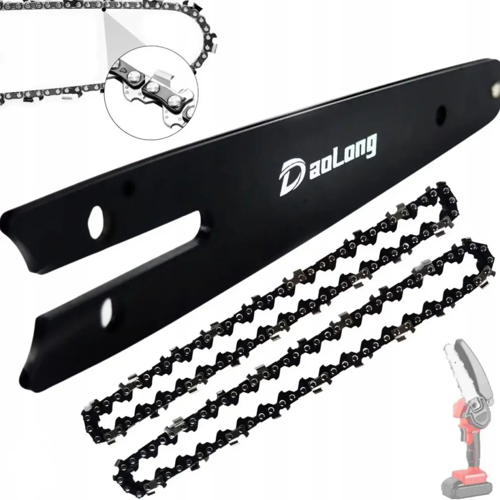 Шина і 2 ланцюги від DaoLong - це комплект для акумуляторної міні-пили, що підходить для широкого спектра завдань, як-от розпилювання дров, обрізання саду, ремонт тощо.