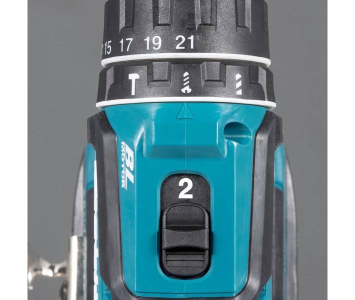 Двошвидкісний редуктор із металевими шестернями практично не нагрівається навіть під час інтенсивного використання девайса. Акумуляторний ударний дриль-шуруповерт Makita DHP485RFJ працює у двох швидкісних режимах: 0-500/1900 об/хв. 21 варіант регулювання крутного моменту дає можливість вибрати ступінь затягування залежно від матеріалу та обраного кріпильного елемента.