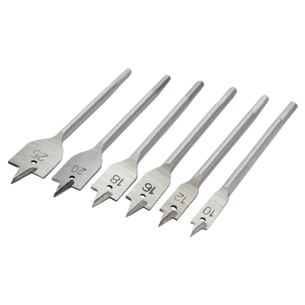 Набір свердл по дереву перових 6шт (Ø10, 12, 16, 18, 20, 25мм, довжина 150мм) GRAD (1314665) призначений для свердління отворів у виробах з деревини м'якої і середньої твердості, в легко оброблюваних будівельних матеріалах (гіпсокартоні, МДФ-панелях, пластику та ін.). Переваги: Центрувальний робочий наконечник; Дві ріжучих кромки центруючого наконечника; Дві пари різальних крайок торцевої і бічний робочих частин; Отвір для підвішування; Цифрове маркування; Шестигранний хвостовик (НEX 1/4 "); Сталь 45; Твердість 45-48 HRC; Можливість свердління глибоких отворів; Термічна обробка стали при виготовленні свердла.