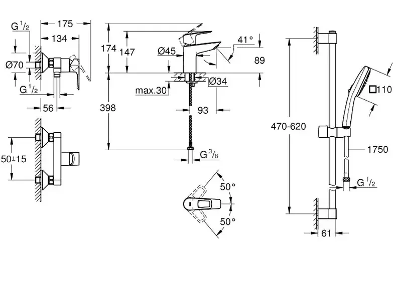BauLoop Набір змішувачів для душу (23337000 +32816000 + 27598000): тримач для душу, душова штанга (висота 60 см), ручна лійка (діаметр 100 мм, мультирежимність 2 види струменя), змішувачі, шла