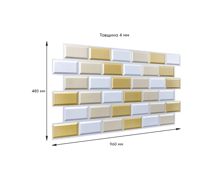 - Після підсихання клею продовжити монтаж наступного ряду. Розмір ПВХ панелі – 960ммх480мм. Товщина – 4 мм.