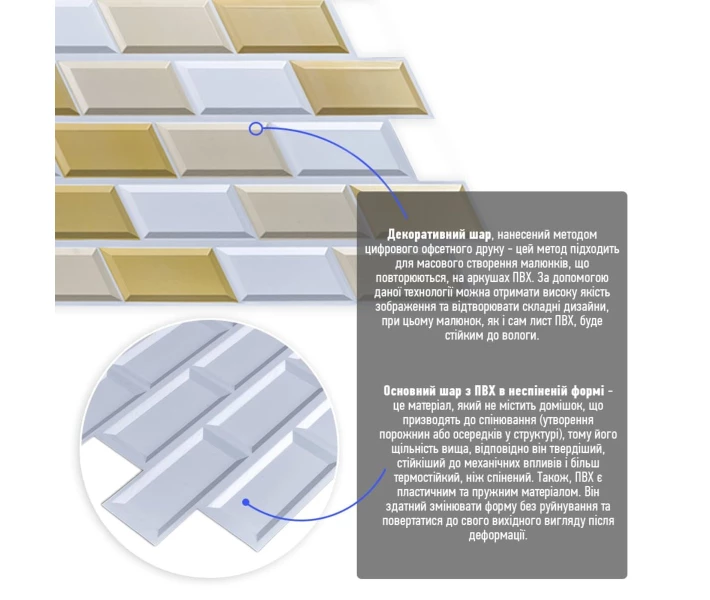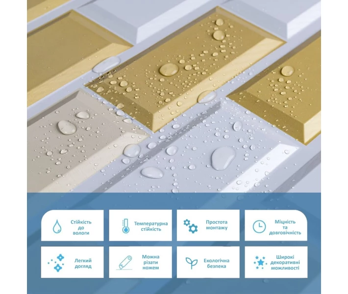 Панелі дуже прості у монтажі, практичні у використанні та довговічні. Для монтажу панелей Вам потрібен буде: клей для ПВХ, ножиці або монтажний ніж, рівень чи лінійка, скотч (для фіксації свіжих панелей).