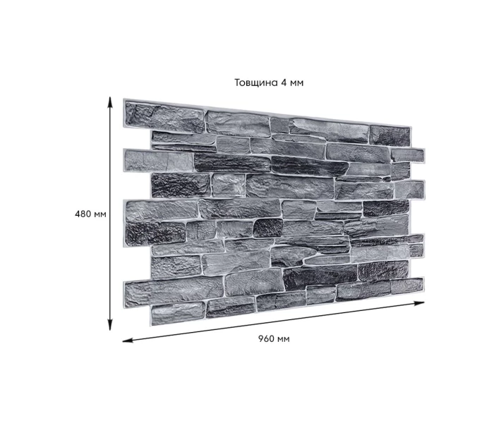 - Після підсихання клею продовжити монтаж наступного ряду. Розмір ПВХ панелі – 960ммх480мм. Товщина – 4 мм.