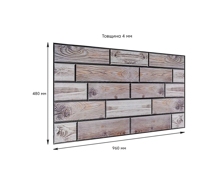- Після підсихання клею продовжити монтаж наступного ряду. Розмір ПВХ панелі – 960ммх480мм. Товщина – 4 мм.