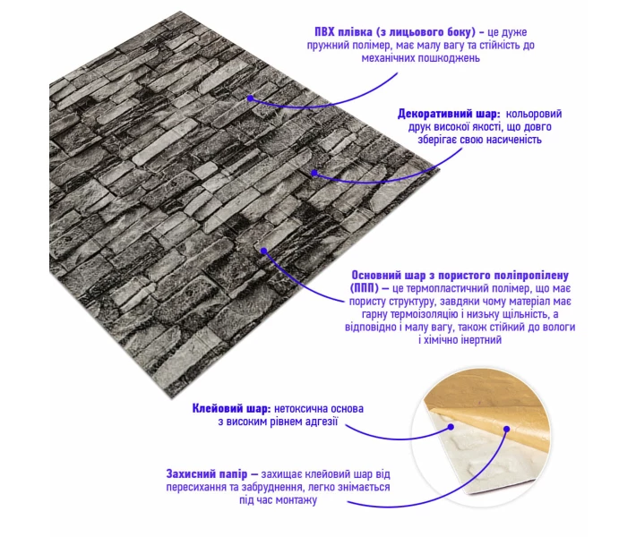 Матеріал - спінений поліпропілен. Термін служби складає більше 20 років. Переваги панелей: Легкий монтаж; Підходять для використання на нерівних поверхнях; Якісний утеплювач; Має властивості шумоізоляції та вібропоглинання; Можна мити;