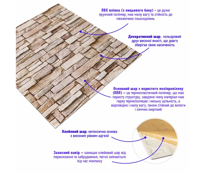 Матеріал - спінений поліпропілен. Термін служби складає більше 20 років. Переваги панелей: Легкий монтаж; Підходять для використання на нерівних поверхнях; Якісний утеплювач; Має властивості шумоізоляції та вібропоглинання; Можна мити;