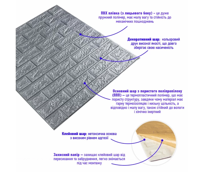 Легкість монтажу: наявність клейового шару дозволяє встановити панелі без необхідності застосування додаткових матеріалів.