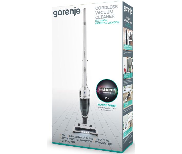 Пилосос Gorenje SVC180FW призначений для прибирання житлових приміщень і невеликих офісів. Він не використовує електроенергію мережі, тому в ньому в якості елемента живлення встановлена батарея на літій-іонній основі. Стандартний акумулятор на 18 В дає 50 хвилин безперервного прибирання. Після цього необхідно 6 годин, щоб відновити витрачений енергоресурс.